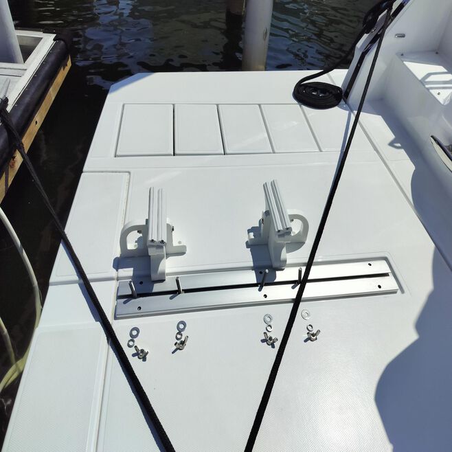 VersaChock channel-mounted tender chocks for channels are removable, super compact, and universal. Perfect for securing rigid hull tenders, dinghies, and jet skis on swim platforms with channels. Kits come with eight ½” stainless steel carriage bolts that are inserted into swim platform channels (channels are existing/not sold by VersaChock). Double-wide bunks are made with high-quality HDPE and semi-rigid hull cushioning strips. Remove chocks when not in use for a TRIP-FREE deck! Key Features: